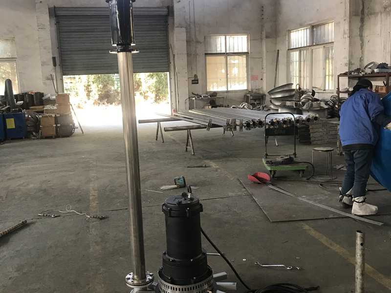 QXB(II)型潜水曝气机采用独特的水力部件设计,优化叶轮与导叶之间的间隙(小于1mm),较之老型号曝气机叶轮与导叶之间的间隙(大于5mm)要小许多,加上独特的星形叶轮设计、放射式水、气混合通道,在高速旋转电机的驱动下,叶轮在水中产生离心力,在离心性力作用下使叶轮周围形成一个负压区,空气通过进气管被吸入,空气和水在混合室内被高速旋转叶轮撕碎,气液湍流混合并高速经扩散通道出来,形成气泡,将空气中的氧气融入水中,由于水流强力喷射,且星形叶轮把空气泡切割更细、更小、更密,使得空气泡与待处理液体接触面就更大,空气被剪切成大量微小气泡,提高了传质面积,并形成螺旋状有效水循环,大量的氧被溶于水中。