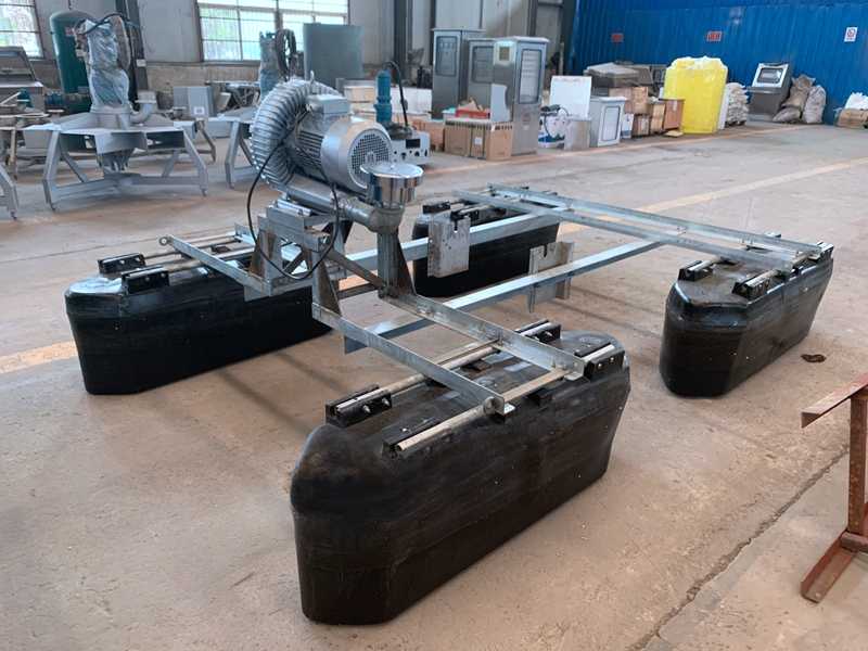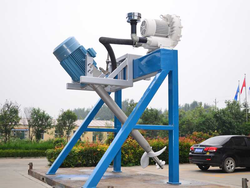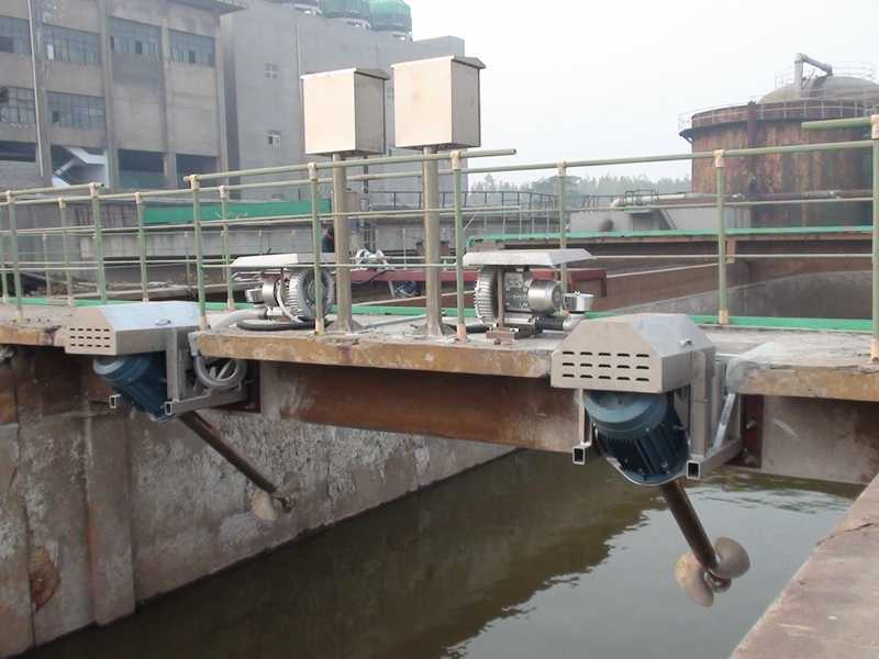 电动机带动螺旋桨旋转,高压旋涡气泵使得空气通过进气管进入空气进孔达到螺旋桨,使得其水混合造成微小气泡,汽水混合物水平、竖直方向离开螺旋桨,达到有效混合和向水中曝气。